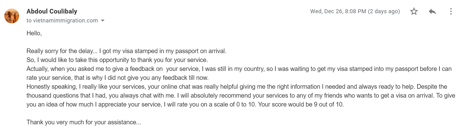 C. ABDOULAYE is an Ivorian Coast. He ask for a three months multiple entries visa with private letter. We already chatted with him on the website online support tool, and gave him as many information as he wish. After  1 day from the date applying, he received the visa approval letter. He used this letter to get visa on arrival, and he is in Vietnam now.