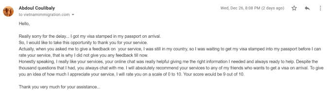 Honestly speaking, I really like your services, your online chat was really helpful giving me the right information I needed and always ready to help. Despite the thousand questions that I had, you always chat with me. I will absolutely recommend your services to any of my friends who wants to get a visa on arrival. To give you an idea of how much I appreciate your service, I will rate you on a scale of 0 to 10. Your score would be 9 out of 10.