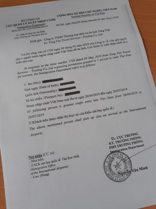 The approval letter is the official letter which allows you to enter Vietnam and get visa on arrival. This letter indicates the entry date and the exit day clearly. The length of your stay in Vietnam is also showed in this approval letter. You can enter Vietnam at the entry date or later than the entry date and leave Vietnam some days before the exit date or at the exit date.