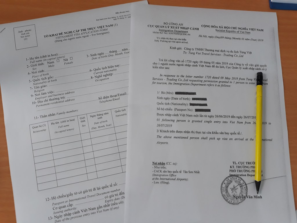 – Вьетнамга келгенде виза алуу үчүн төмөнкү документтердин болуусу зарыл: паспорттун түп нускасы + виза ырастоо кат + Форма NA1 (сиздин убактыңызды үнөмдөө үчүн бул форманы биз мурунтан электрондук дарегиңизге жөнөтөбүз; форманы толтуруп, сүрөтүңүздү тиркеп, кол коюңуз зарыл) + Виза мөөрдүн баасы (25$/кишиге бир жолу кирүгөө 1 жана 3 ай мөөнөт менен, 50$/кишиге көп жолу кирүгөө 1 айдан 3 айга чейин, 95$/кишиге көп жолу кирүгөө 6 айга чейин жана 135$/кишиге 1 жылга чейин)