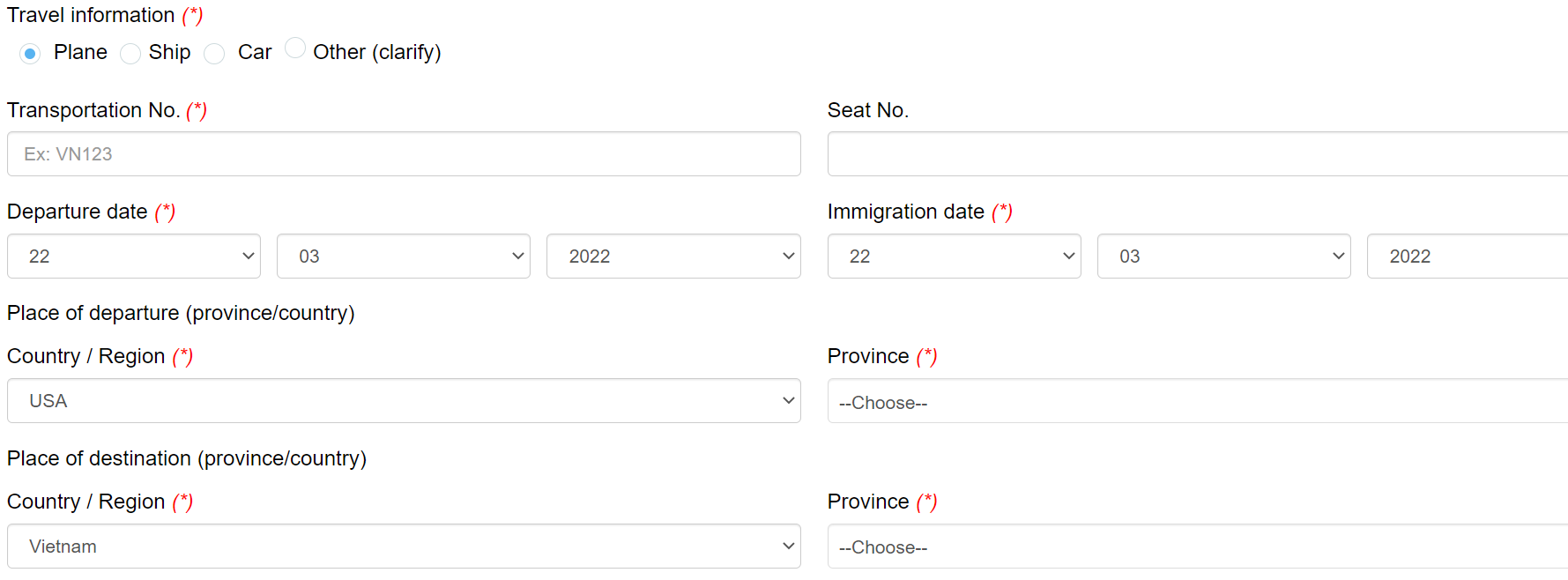 • Place of destination: Choose “Vietnam” as country and clarify province/city which you arrive in (Note: if you fly to Ho Chi Minh city then take the domestic flight to Ha Noi, you still need to choose “Ho Chi Minh city” as place of destination.