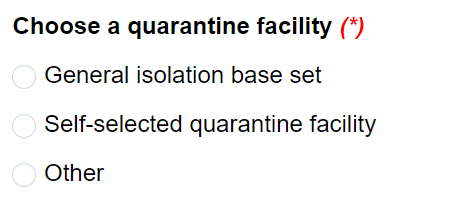 14/ Quarantine facility: You choose “other” because right now you don’t need to take quarantine after entering Vietnam. Then you type “no quarantine is required” at “enter another quarantine base”
