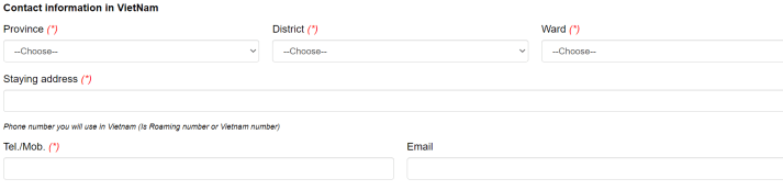 10/ Contact information in Vietnam: Declare the address where you stay in Vietnam as well as your phone number, email address