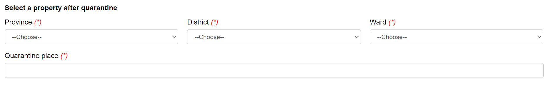 After March 15th, 2022, Vietnam cancelled quarantine requirement after entry for all people. Therefore, in this field, you should enter the address which you stay after enter Vietnam.