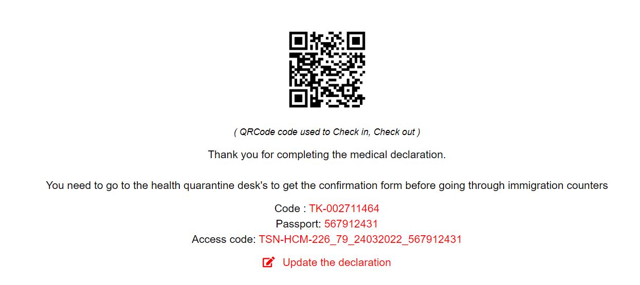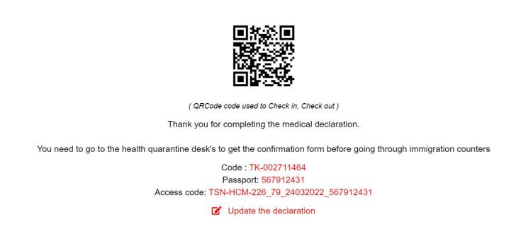 21/ After successfully submitting the form, you will see an QR code and summarization of your medical declaration. Please take a screenshot of this QR code so that you can show it at Medical Control Counter after entry. If you have any wrong information or you want to update the information, just click on “update the declaration” and edit.