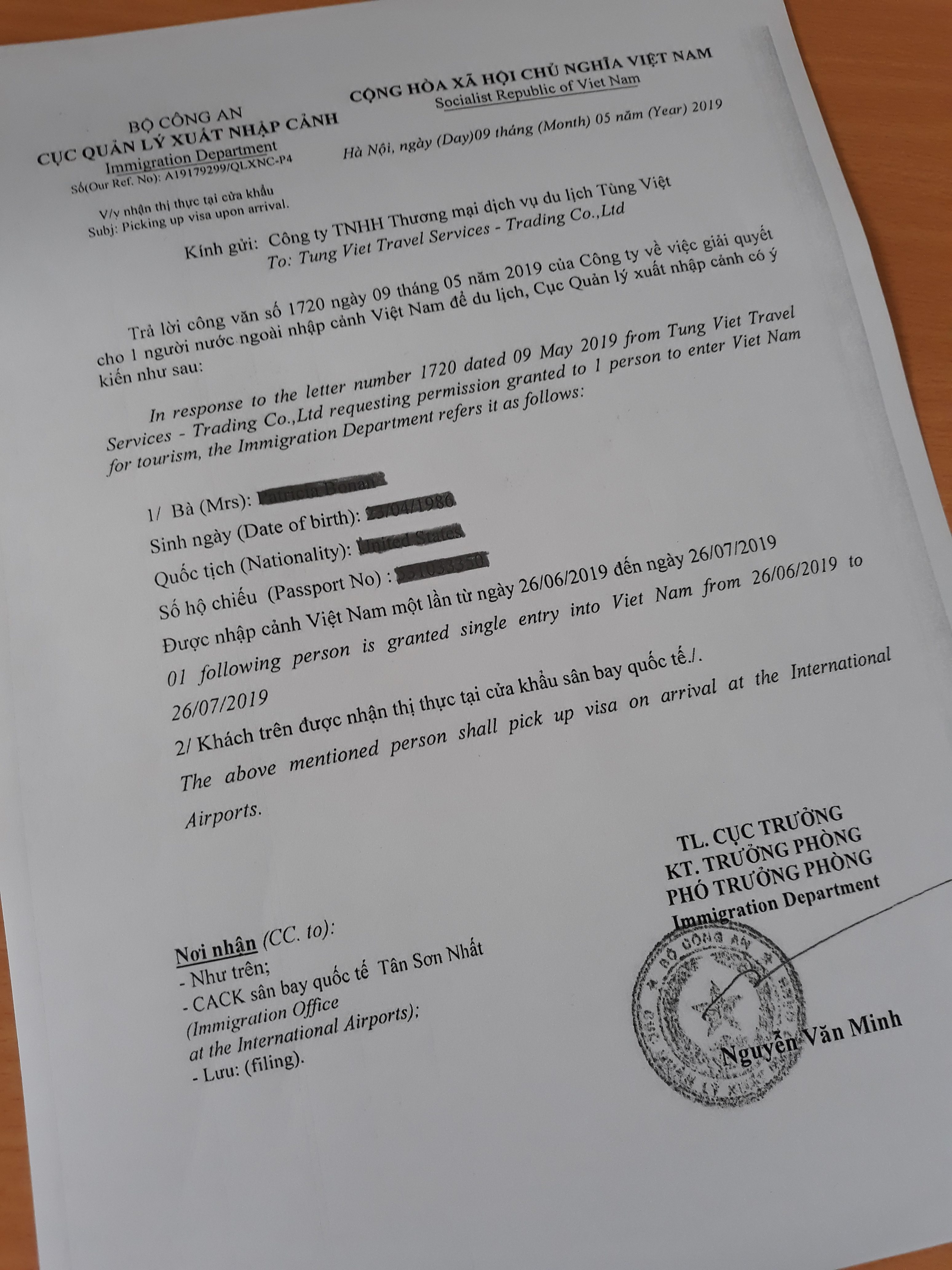 許可函(批准信)是越南移民局的官方文件,在文件中明確規定文件中的姓名被允許在越南機場取得簽證。因此,只要獲得許可函,您在越南機場降落時肯定會可以獲得簽證。
