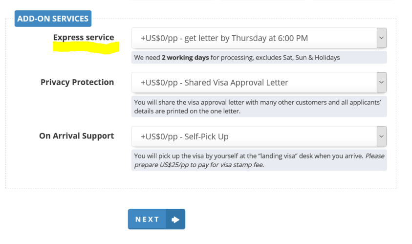 - 4個小時處理服務:如果您在上午08:00之前申請(越南時間GMT + 7),您的申請要求將在當天的下午12:30 完成的。或如果您在下午02:00之前申請(越南時間GMT + 7),您的申請要求將在當天的下午06:30 完成的。緊急費為25美元。