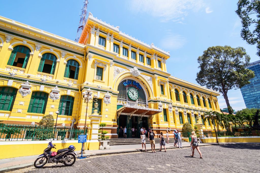 ที่ทำการไปรษณีย์ด้วยสถาปัตยกรรมสไตล์ตะวันตกที่เก่าแก่ยาวนาน 127 ปีในโฮจิมินห์ซิตีแห่งนี้จะทำให้คุณประทับใจมาก แม้ว่าสีของผนังด้านนอกจะเปลี่ยนบ่อย แต่การตกแต่งภายในยังคงงดงามเหมือนเดิม: โดมโค้งแบบคลาสสิก แผนที่วาดด้วยมือและตู้โทรศัพท์เก่า… นอกจากนี้ ของที่ระลึกเกี่ยวกับเมืองไซ่ง่อนที่ท่านสามารถนึกถึงก็จะเห็นอย่างง่ายดายที่นี่ มั่นใจซื้อเลยนะเพราะคุณภาพของสินค้าที่นี่คือสามารถรับประกันค่ะ อย่าลืมซื้อโปสการ์ดฝากเพื่อนนะ อวดเขาว่า เรามาถึงไซ่ง่อนแล้วอะ ราคาโปสการ์ดใบละ 5000 ด่อง และแสตมป์ส่งไปไทย 11000 ด่อง (รวมกันไม่ถึง 1 ดอลล่าร์เลย)